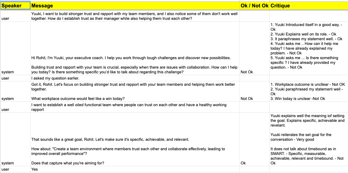 Here's what that looks like in practice. A coach reviews an AI response and marks it "Not Ok." Her commentary: "The agent gave advice before asking a single question about the situation. A good coach would ask a follow-up first." That critique becomes a constraint in the next prompt version: always ask a clarifying question before offering a suggestion. The next generation of responses follows the constraint. The coach reviews again, refines further, and the system gets closer to what good coaching actually looks like — not in theory, but in her expert judgment.